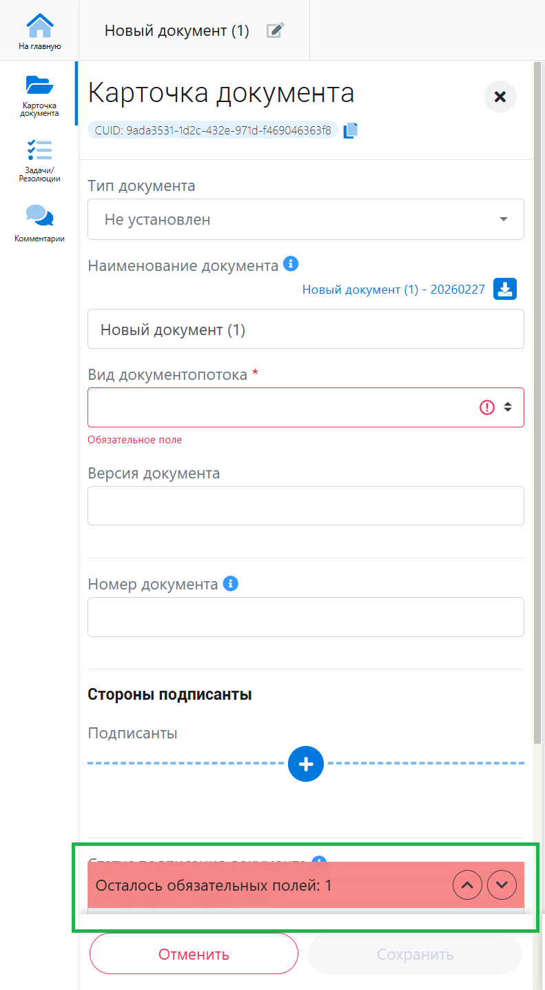 Система автоматически подсказывает, где именно не хватает данных. Пользователь сразу видит проблему и устраняет её до отправки документа дальше по маршруту: