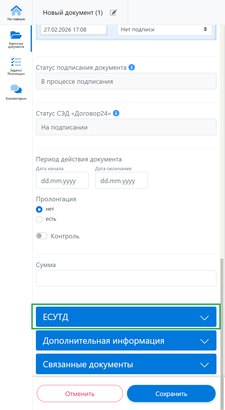 Карточка документа представляет собой набор полей, в которых хранится базовая информация о документе. Это своего рода паспорт, который позволяет в дальнейшем легко работать с этим документом.