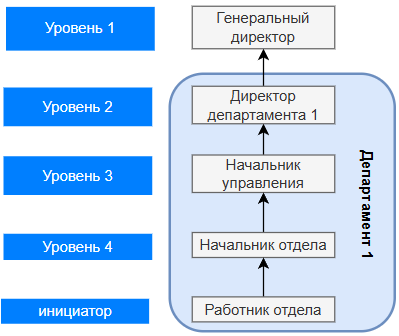 Автонахождение руководителя инициатора. Данная функция позволяет создавать один маршрут, который будет сам находить необходимых участников вместо создания множества однотипных маршрутов. В маршрут будет подставлен руководитель инициатора документов определенного уровня. Уровень руководителя определяется исходя из организационной структуры и отображается в всплывающем окне