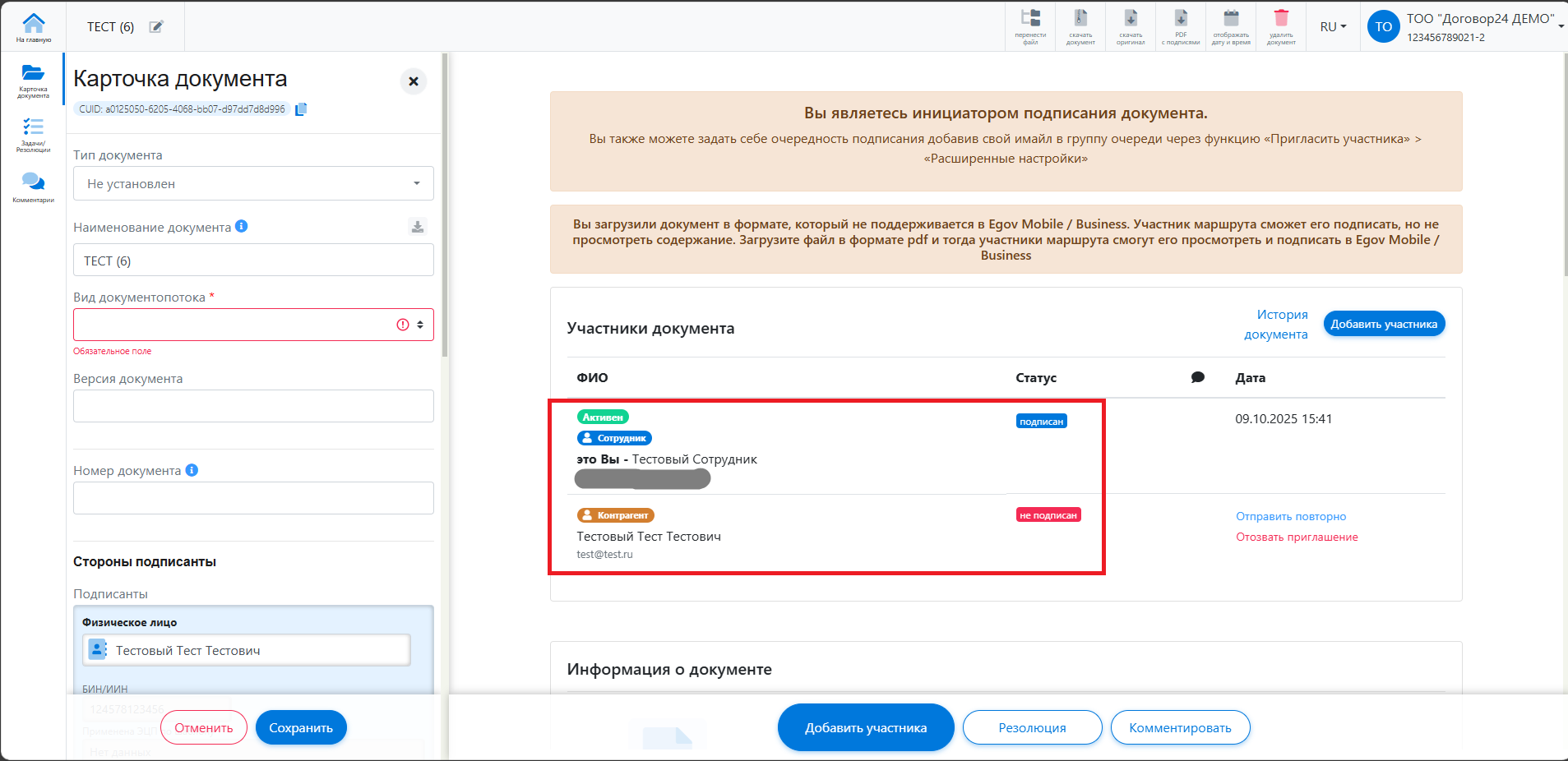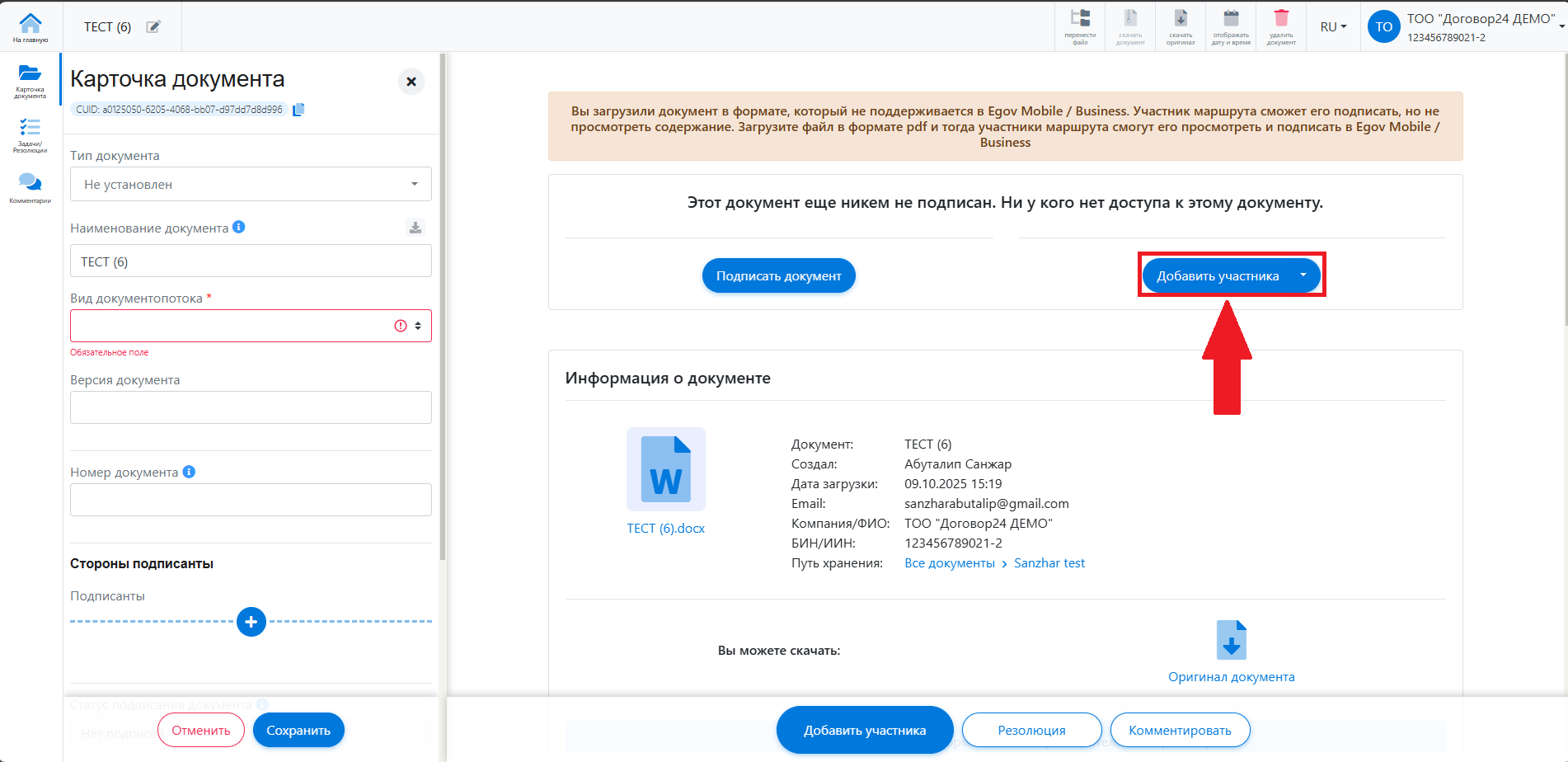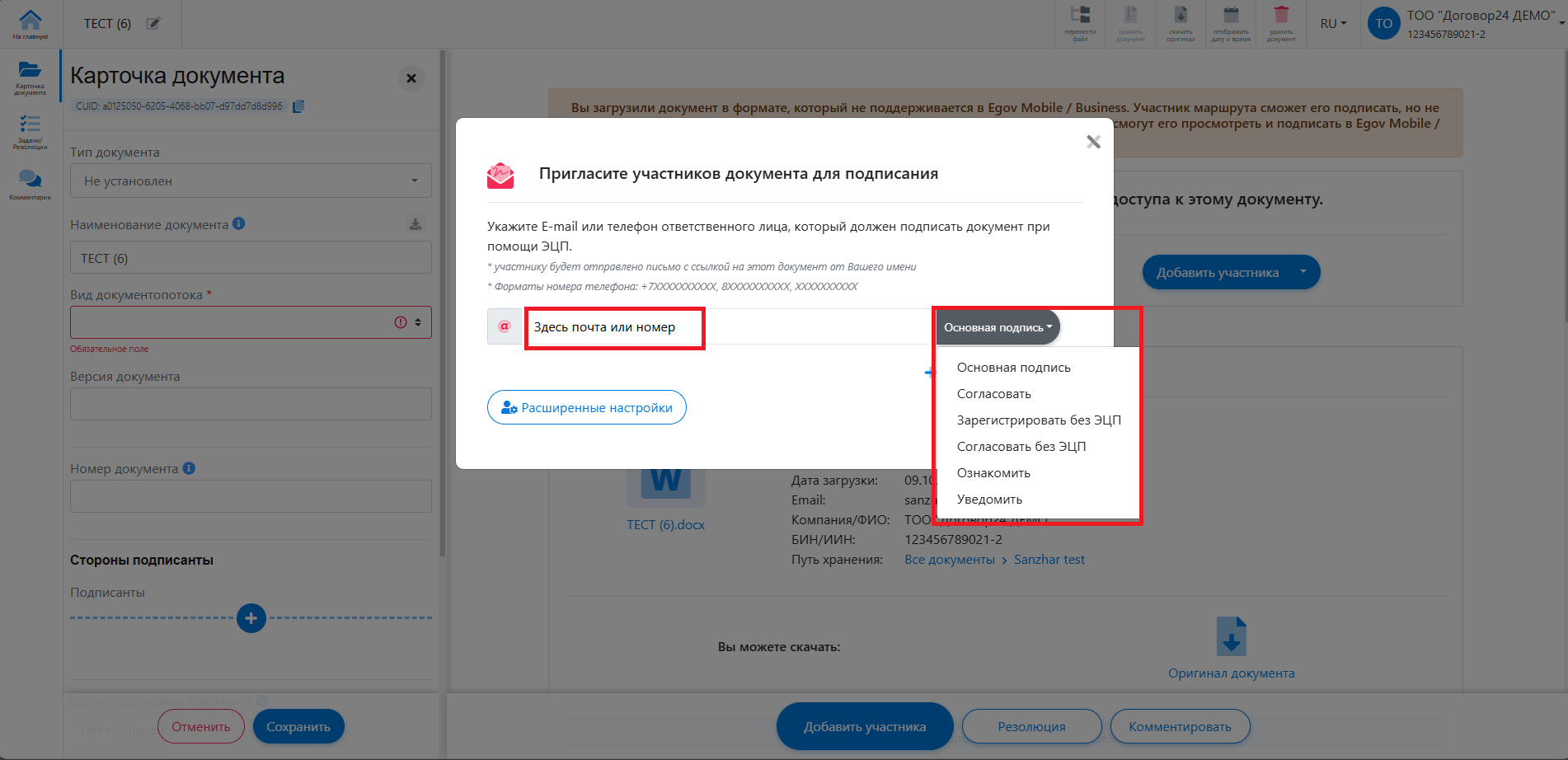 - Укажите участника — введите e-mail или номер телефона, выберите тип подписи и нажмите на «добавить пользователя»