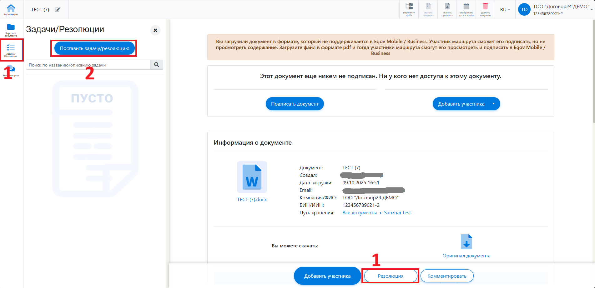 Если требуется поставить задачу для исполнения, на левой панели нажмите «Задачи/Резолюций”. Затем «Поставить задачу/резолюцию».