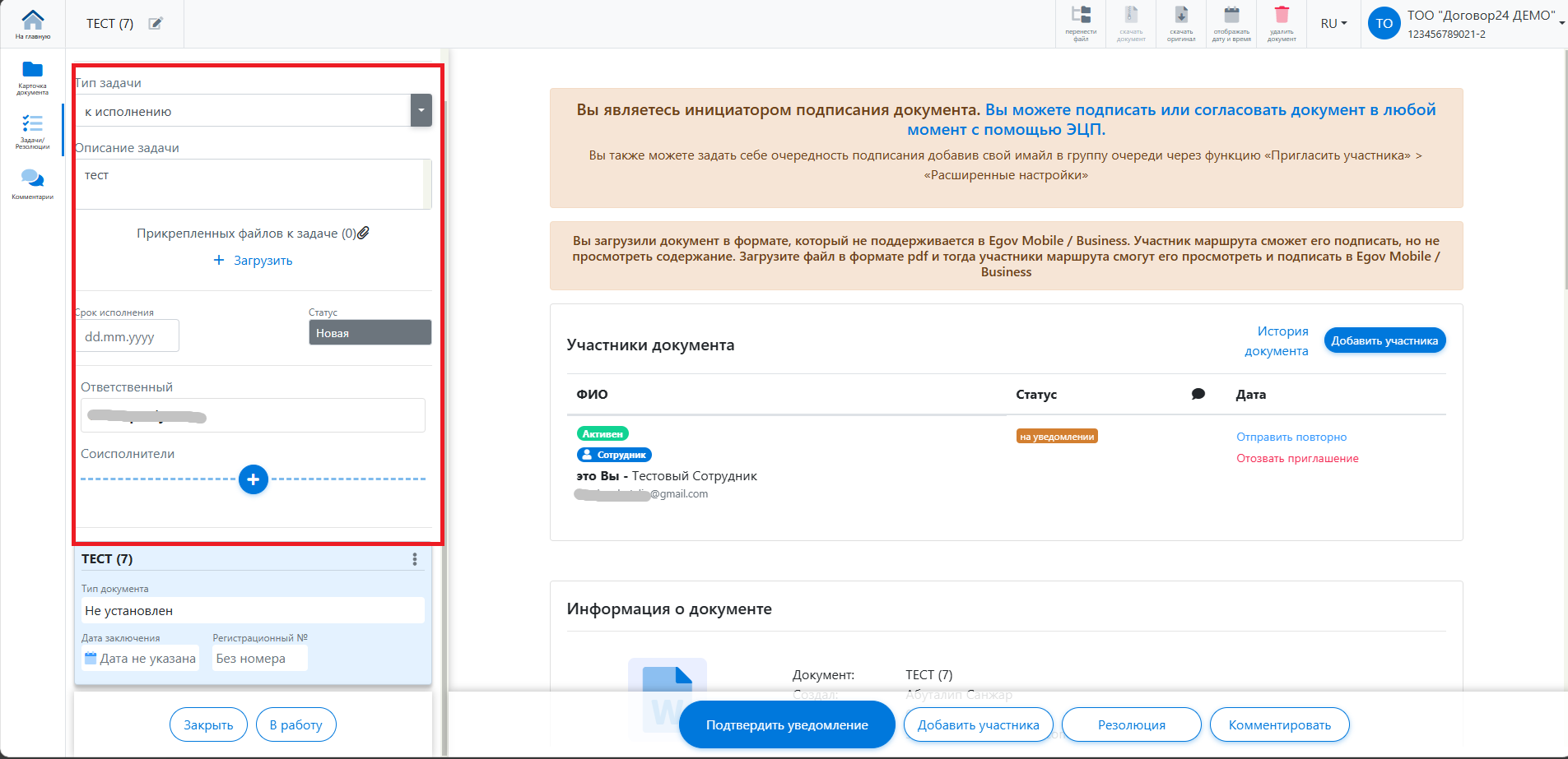 В открывшейся задаче выбираете «Тип задачи», заполните Описание задачи, можно прикрепить файл к задаче и поставить «Срок исполнения». Далее выбираете сотрудника для поля «Ответственный» и «Соисполнитель». Финальным шагом для создателя задачи будет отправка задачи.
