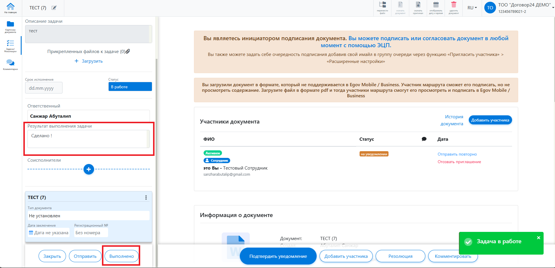 Если требуется выполнить задачу нужно открыть страницу документа и нажать на «Задачи/резолюции» в левой панели. В этом окне можете ознакомиться с задачей и взять «В работу». Когда вам нужно будет закрыть задачу, нужно заполнить «Результат выполнения задачи» и нажать на кнопку «Выполнено» после чего статус задачи изменится на выполнено!