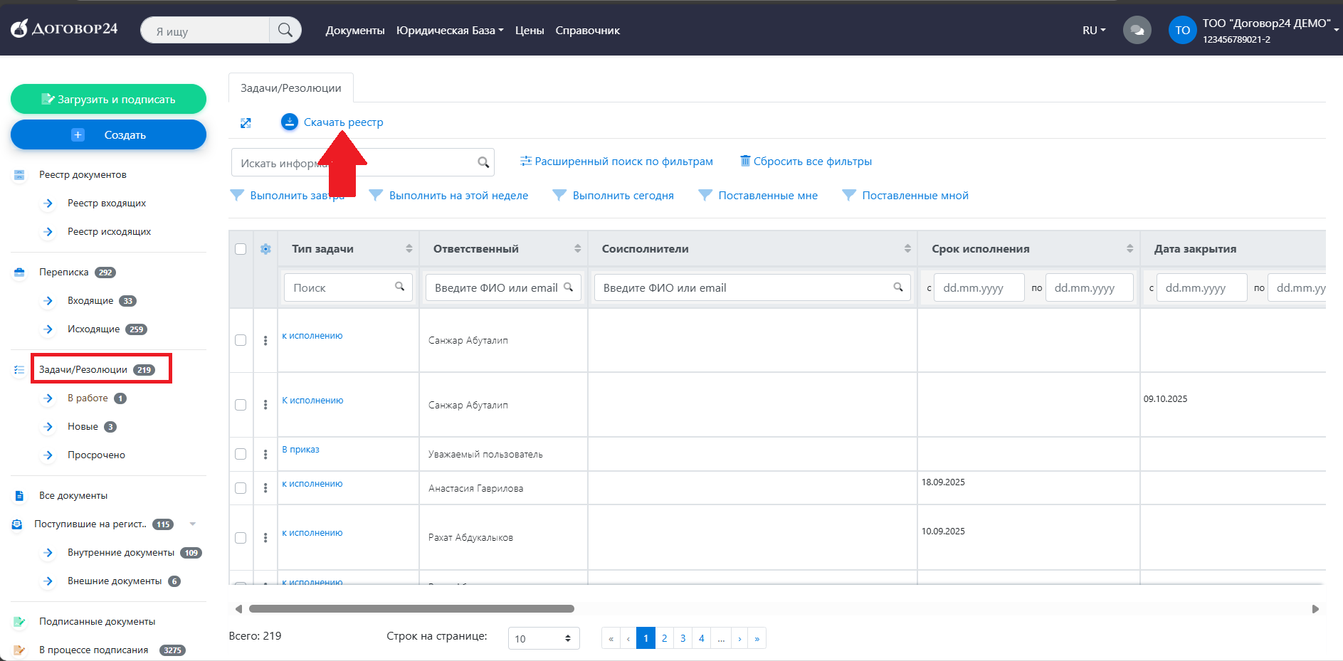 Откройте реестр задачи/резолюций, поставьте требуемые фильтры и нажмите «Скачать реестр»