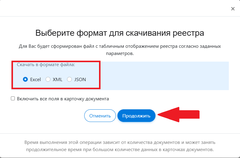 В этом окне вам нужно выбрать формат документа в котором сформируется реестр. На выбор Excel, XML, JSON. Затем нажмите на кнопку «Продолжить» и реестр начнет форматироваться