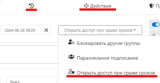 - При установлении «Типа срока» необходимо настроить действия, если подписанты не успеют согласовать документ в этот срок. Для этого укажите дату и в столбце «Действия» выберите «Открыть доступ при срыве сроков», это откроет доступ к документу следующей группе после установленной даты.