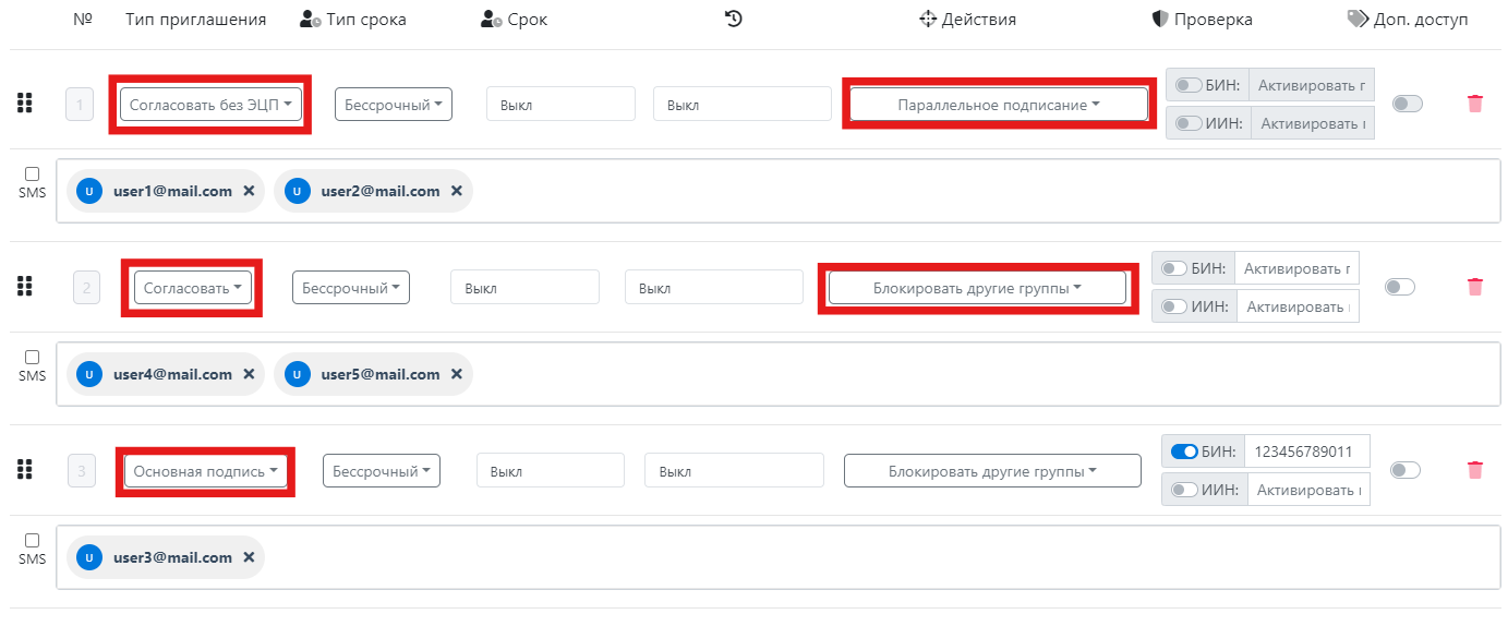 5. Добавьте подписантов в первую группу (по умолчанию отправка осуществляется по e-mail, но Вы также можете отправлять приглашение по sms, если у Вас подключен SMS — модуль), которая появляется по умолчанию. Тут же можно настроить разного рода условия и проверки в столбцах: