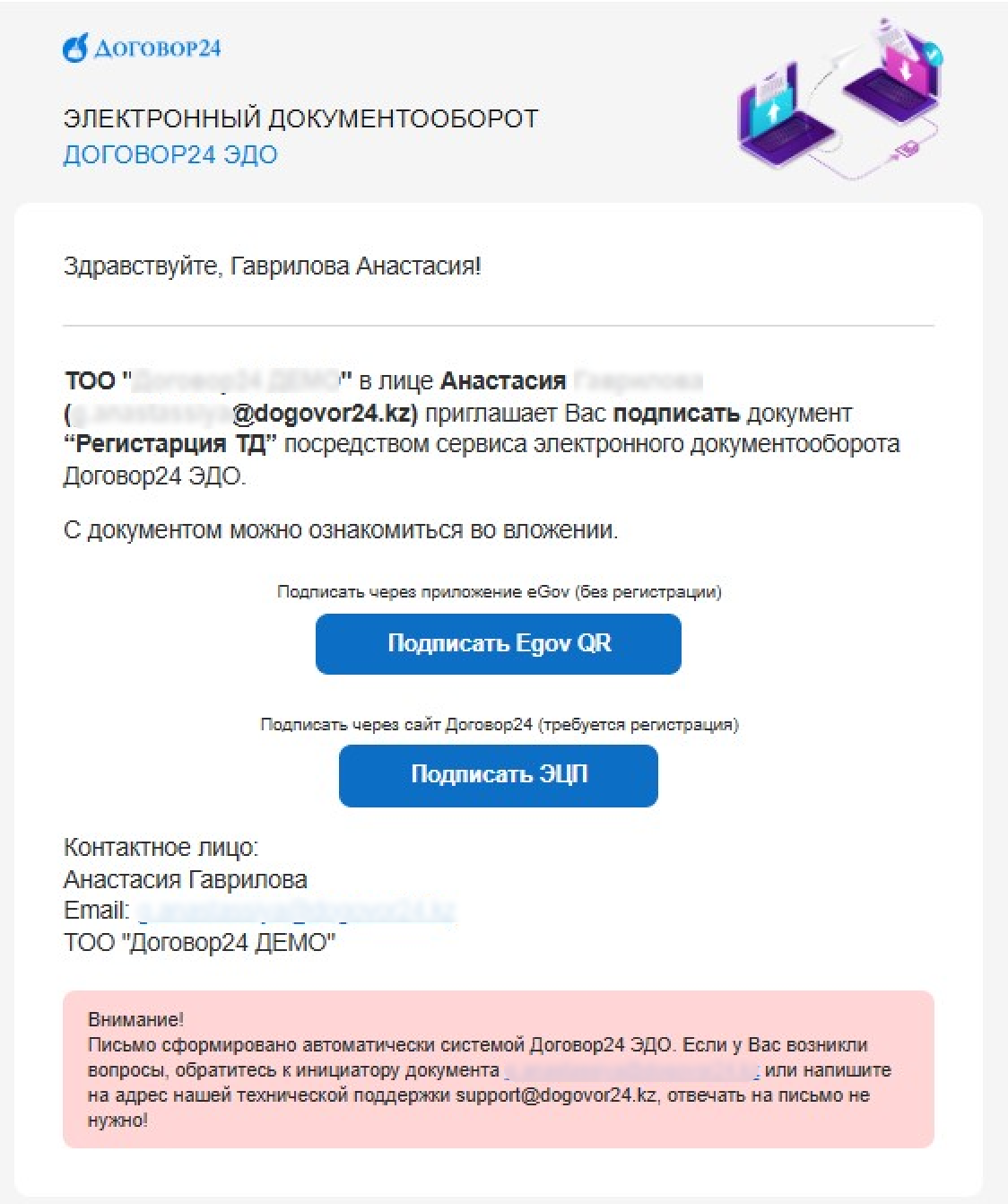 - Если письмо выглядит так, ознакомьтесь с документом во вложении к письму, нажмите «Подписать через приложение eGov» и отсканируйте QR код в приложении egov mobile или egov business.