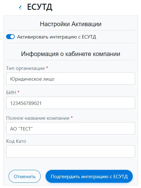 - Подтвердите интеграцию с ЕСУТД посредством ЭЦП юридического лица любого формата