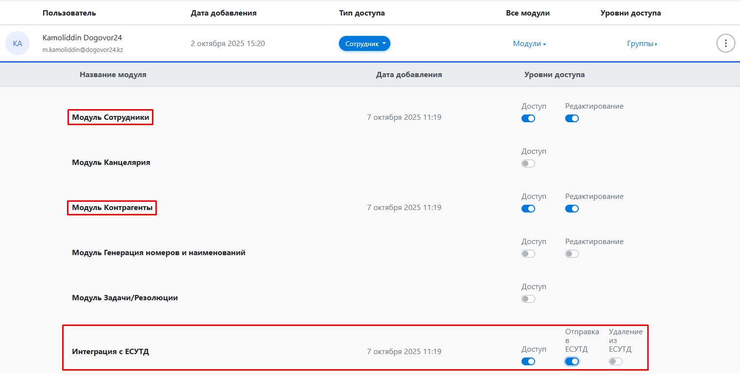 - Найдите в списке пользователя, для которого хотите открыть доступ к отправке в ЕСУТД. Нажмите около него на “Модули”. Убедитесь, что у пользователя есть доступ к модулю Сотрудники (редактирование) , Контрагенты (редактирование) и Интеграции с ЕСУТД (отправка в ЕСУТД).