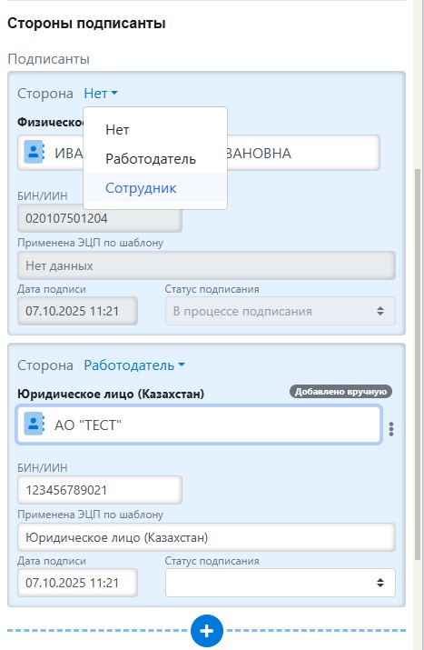- Вернитесь в карточку трудового договора (слева), проставьте обозначение Работодателя и Сотрудника.