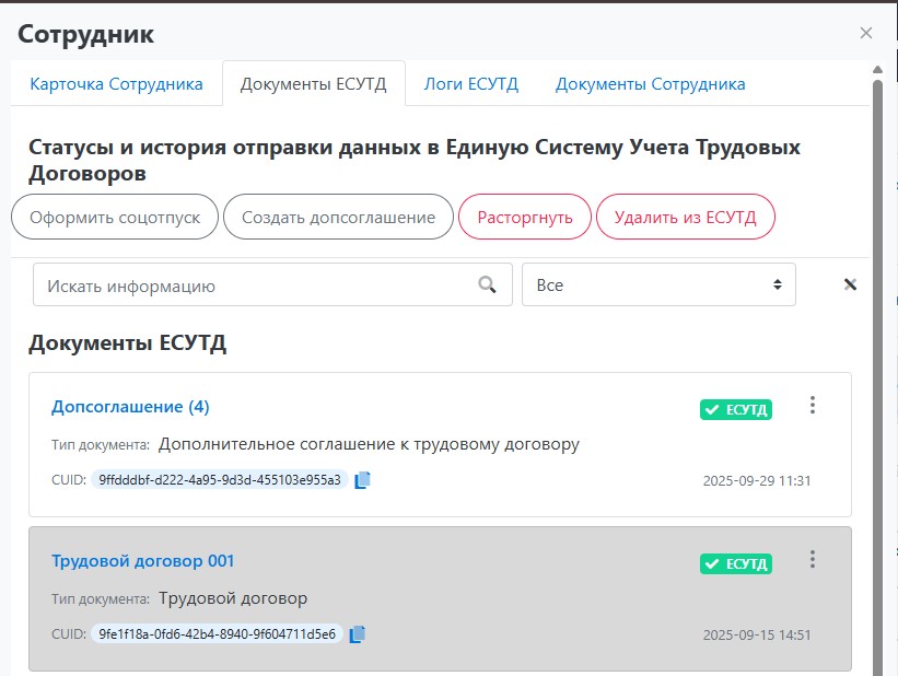 - Когда документ будет отправлен в ЕСУТД, в карточке сотрудника во вкладке “Документы ЕСУТД”, Вы увидите данные по Трудовому договору.