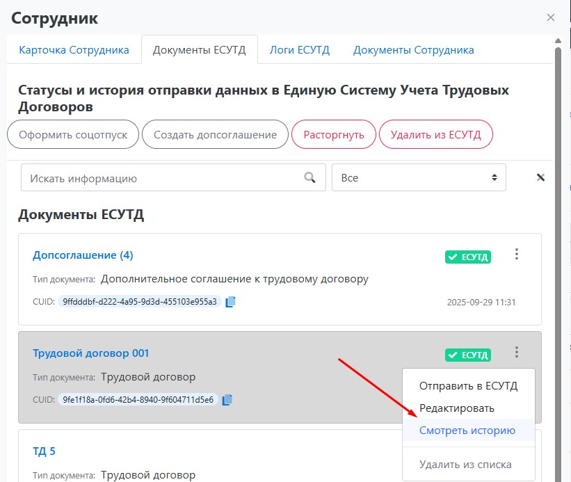- Нажав на значок меню (три точки) справа от названия трудового договора, Вы также можете просмотреть всю историю отправок и взаимодействий с данным документом.