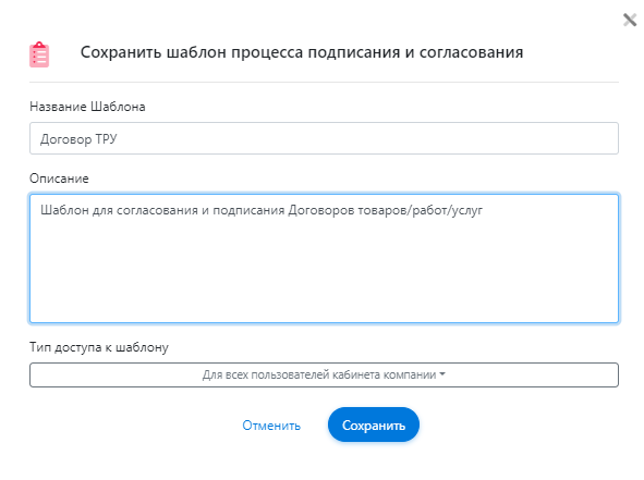 2. В открывшемся окне заполните наименование шаблона, его описание, а также укажите — кто имеет доступ к шаблону и сохраните его. Готово, Вы создали шаблон и теперь можете использовать его в других документах.
