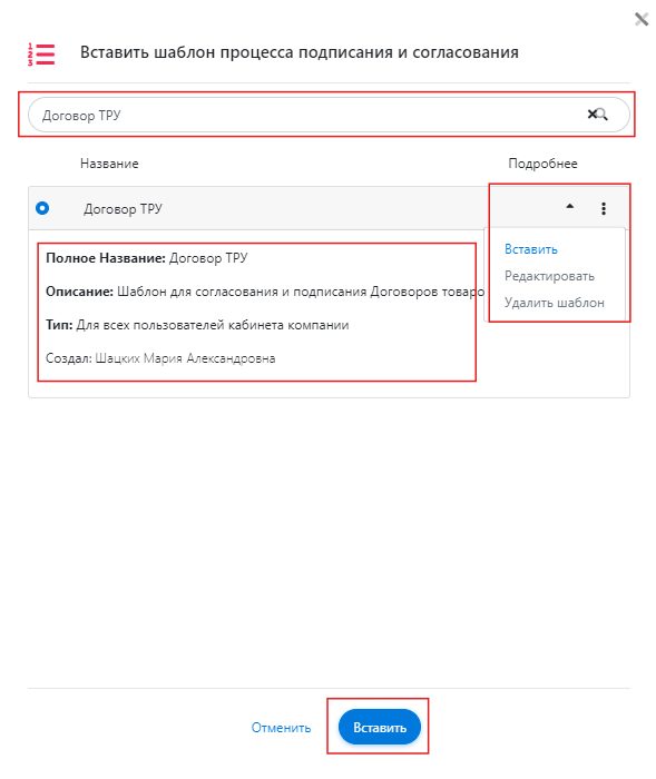 2. В открывшемся окне при помощи поиска Вы можете найти нужный Вам шаблон, просмотреть его описание, а также отредактировать его или удалить. Ну а для того что бы применить его к документу — выберите его и нажмите Вставить